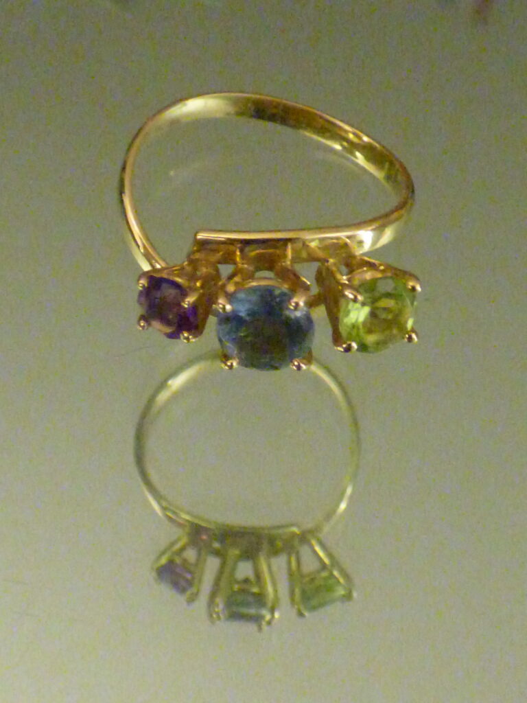- Sertissage d’une péridot, d’une topaze bleu lagon et d’une améthyste.